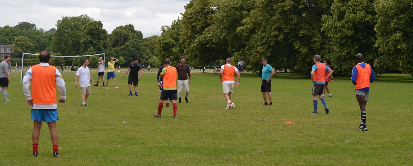 Given the size of the pitch and the goals, relative to the number of players, frequent goalscoring was inevitable, despite some determined defending, and almost everyone made it on to the score sheet (the actual goals per person may have been slightly different).