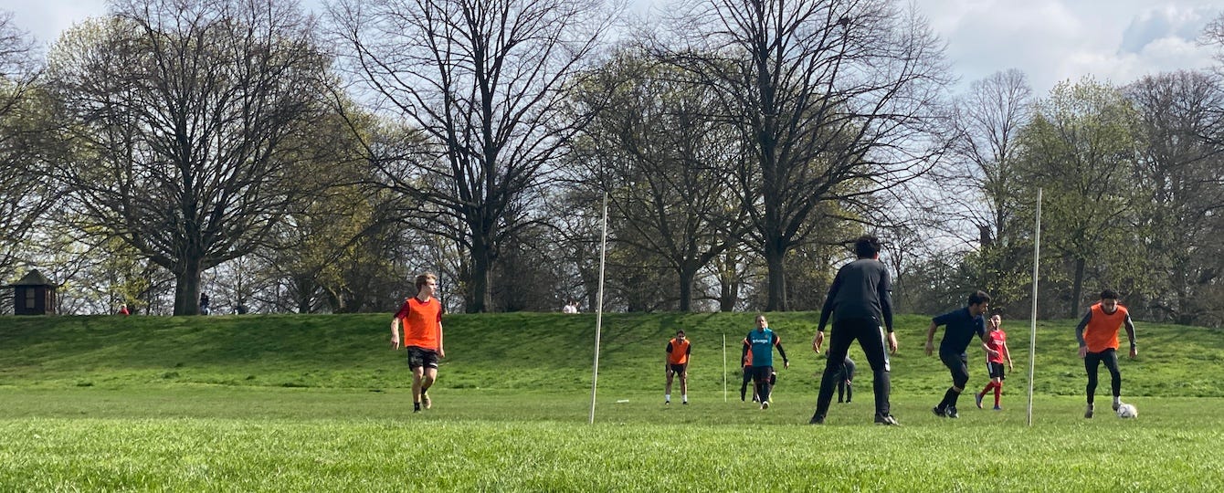 A perfect pitch awaited 11 players on this sunny Easter Saturday morning in Kensington Gardens. The Colours team around new star player Daoud included two Brazilians, Victor (who had clearly honed his skills back home) and new recruit Raul. This was complemented by Al’s youthful brilliance and Francesco’s abundant skills.