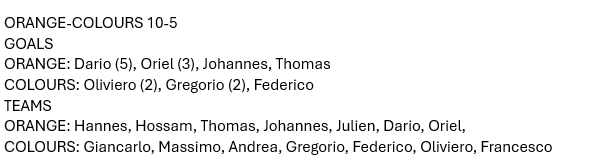 On the opposite front the situation was very different: Colours had an attack-prone formation who couldn’t score and were relegated at the periphery of the pitch despite the hard work in midfield and also due to Hannes reiterated saves: that resulted in a exposed defence with Massimo often outnumbered by the more mobile Orange team. Giancarlo in Colours’ goal was bombarded from every angle, leaving the suspicion that strikers knew he was not the default choice.