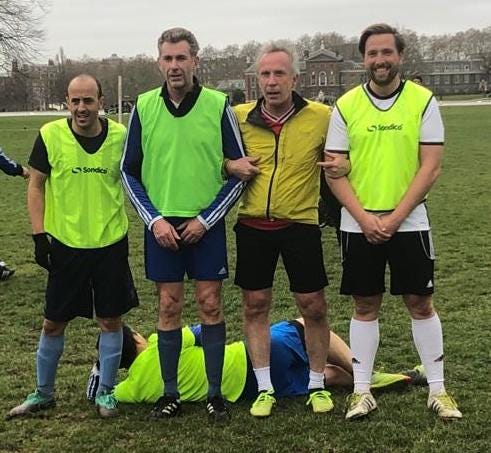 A great crowd (20 players), new white balls, the recovered posts and the return of Alessandro, back in goal after his impressive debut last week. Not to mention the successful introduction of the first official team’ Whatsapp group chat (which however proved of dubious utility when everyone went by the Pond despite the message saying “meet at the usual place”…)