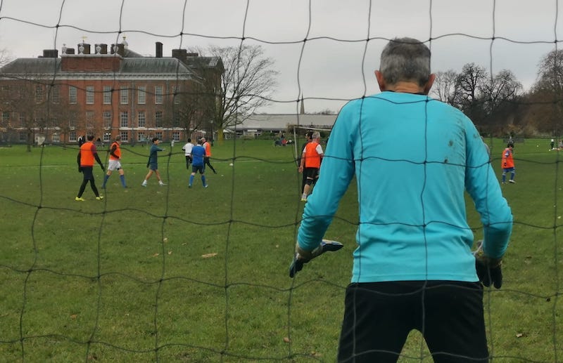 The colours were playing rush goalie, a strategic decision to make the bibs believe they actually had an easy game on their hands. They were singing “who needs a goalie? NOT US!” in their changing room. This time Our Gardener, Thomas, was in goal. Thomas kept his area clean. After weeks of liaising with Manuel Neuer, Thomas was sure to be a major thorn for the bibs. On the other side, Alessandro was covering every inch of his goal.