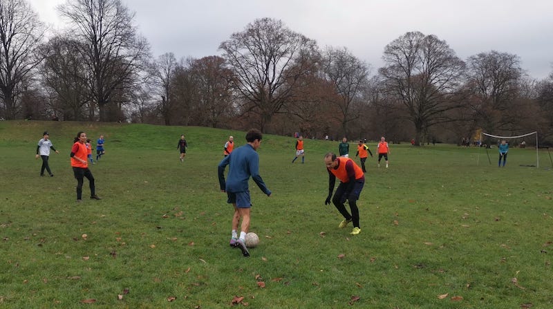 The game continues with speed, Ragni Junior, Andrea kept the ball moving in the bibs territory, it was like a tennis match with fans heads moving left to right every second. There was a change in tactic, and a late start by Chetan, the bibs said enough is enough, and Hannes’s deep pass places the ball right in front of the goal where Julien was ready to score but suddenly our French man lost balance due to the bibs side of pitch with secret holes on the surface causing Julien to trip and lose the opportunity to equalise. The ball goes back to the Bibs half, the ball moving from player to player thanks to Ragni Junior, with precision and once again with Italian flair, Ragni Senior, delivered a fantastic back flick to Daoud for a near second goal.