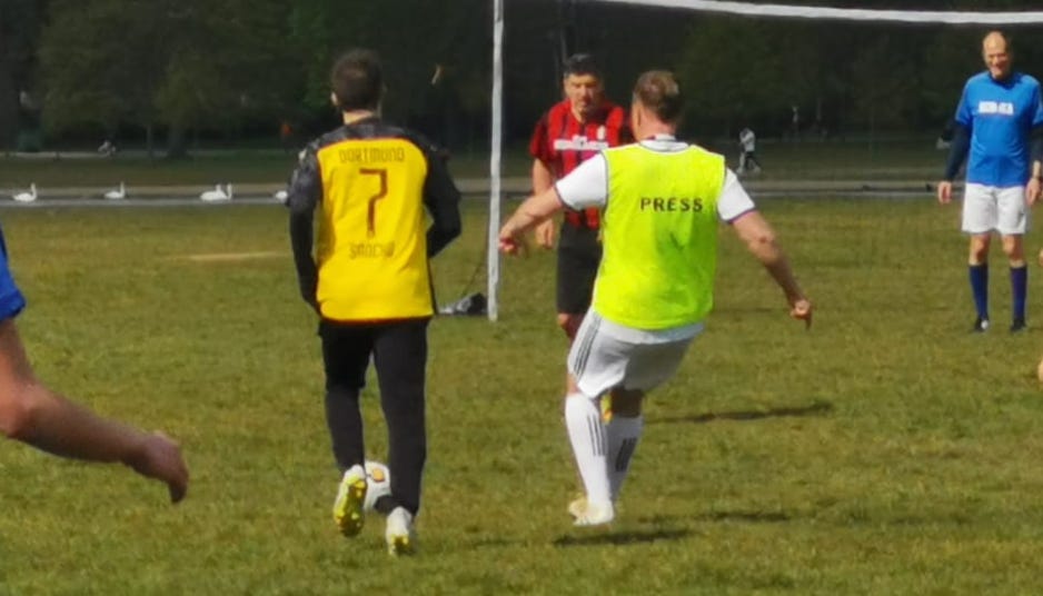 At that point Hannes stopped the game claiming that they were penalised because Andrea was wearing a yellow Borussia Dortmund jersey too similar to a bib. Unfortunately, the Club’s official eye surgeon Vincenzo was not available to express a professional evaluation on the spot but most players agreed that there was a certain chromatic similarity. It was decided that Andrea had to change shirt and wear a black one.